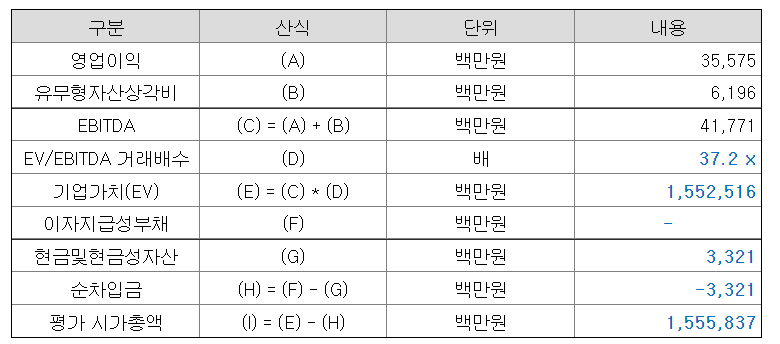 37.2%의 EV/EBITDA를 통해 산정된 일진하이솔루스의 적정 시가총액은 1조 5525억 입니다.