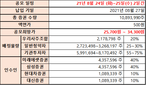 총 증권 수량은 1089만 3990주이며 액면가액은 500원, 공모희망가액은 25,700원 ~ 34,300원 입니다.