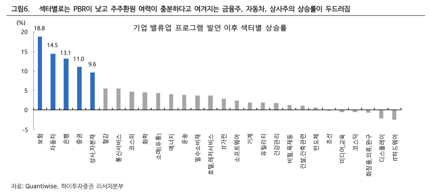 발표와 동시에 ▲금융, ▲자동차, ▲상사 및 자본재, ▲일부 소매 및 유통 업종 등 PBR 1배 미만의 저 PBR 기업의 주가가 급등 했습니다.