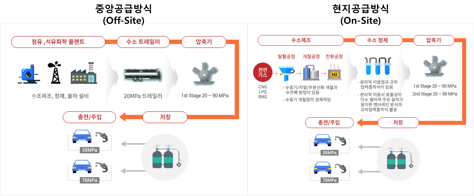 수소 충전소는 수소 생산 시설에서 트레일러나 파이프라인을 통해 수소를 직접 공급받는 중앙공급방식(Off-Site)과 천연가스(CNG, LNG)를 공급받아 직접 수소를 개질해 제공하는 현지공급방식(On-Site)로 구분됩니다.