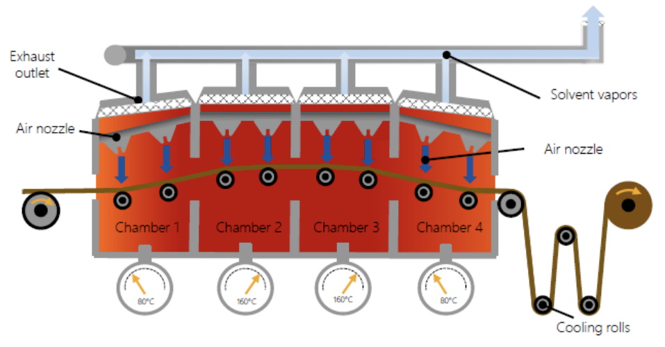 건조 공정에 사용되는 히팅 오븐의 경우 내부에 네가지 챔버로 구분되어지며, 각 챔버의 역할은 다음과 같습니다.