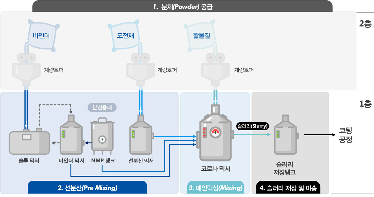혼합 공정은 전극 공정의 첫번째 단계로 양극/음극 각각의 가루형태 활물질에 바인더와 도전재, 용매를 섞어 슬러리 형태로 만드는 공정입니다. 바인더의 경우 Dry Mixing을 하고 도전재의 경우 Wet Mixing을 사용합니다.