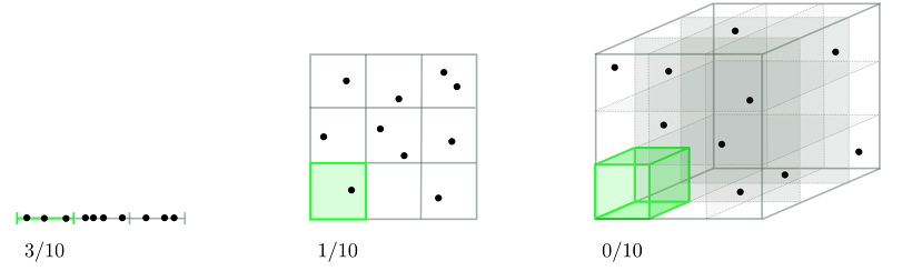 이는 데이터의 차원이 증가할 수록 데이터를 담고 있는 공간의 부피가 기하급수적으로 증가하면서 데이터 밀도가 희박해지는 현상을 말합니다.