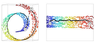 위의 Swiss Roll 그림을 다시 보면, 고차원에서 데이터 A와 B간 가장 가까운 유클리디안 거리상에서 의미상으로는 (데이터간 밀도가 낮아짐) 가깝지 않을 수 있으나, 이를 매니폴드 평면에 놓고 봤을 땐 의미상으로 더 가까운 것을 알 수 있습니다.
