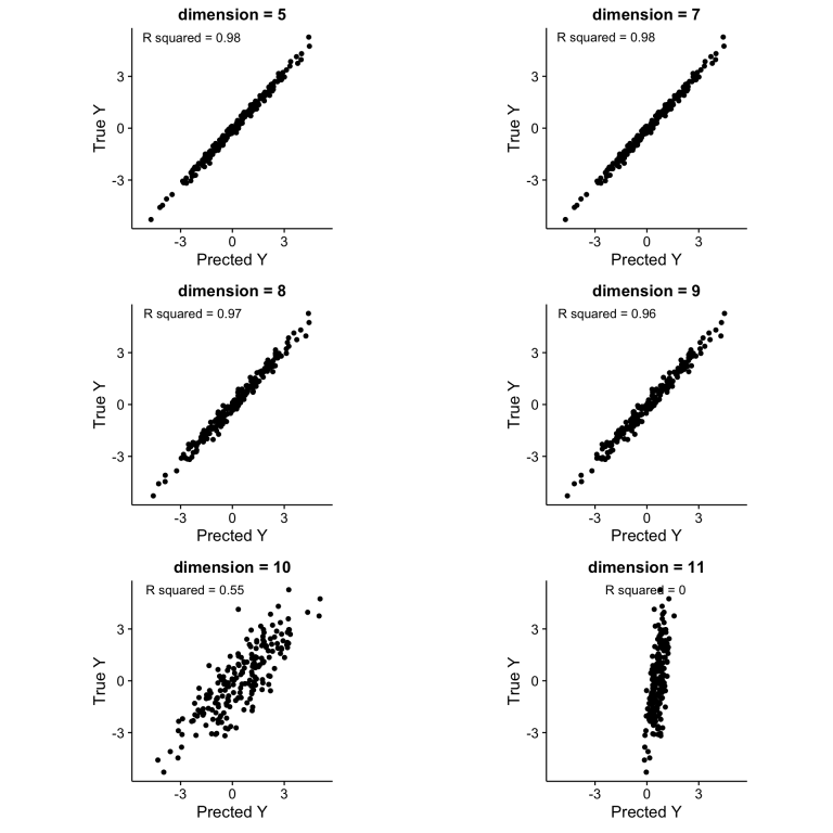 따라서 데이터 개수가 일정할 때 차원의 수가 증가할수록 데이터 예측 성능은 점점 감소하며, 차원의 수가 데이터 개수보다 커지게 되면 (이러한 경우를 underdetermined 문제라고 볼 수 있습니다.) 성능은 급격히 떨어지게 됩니다.