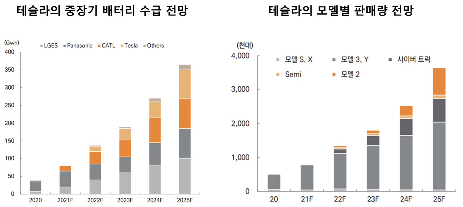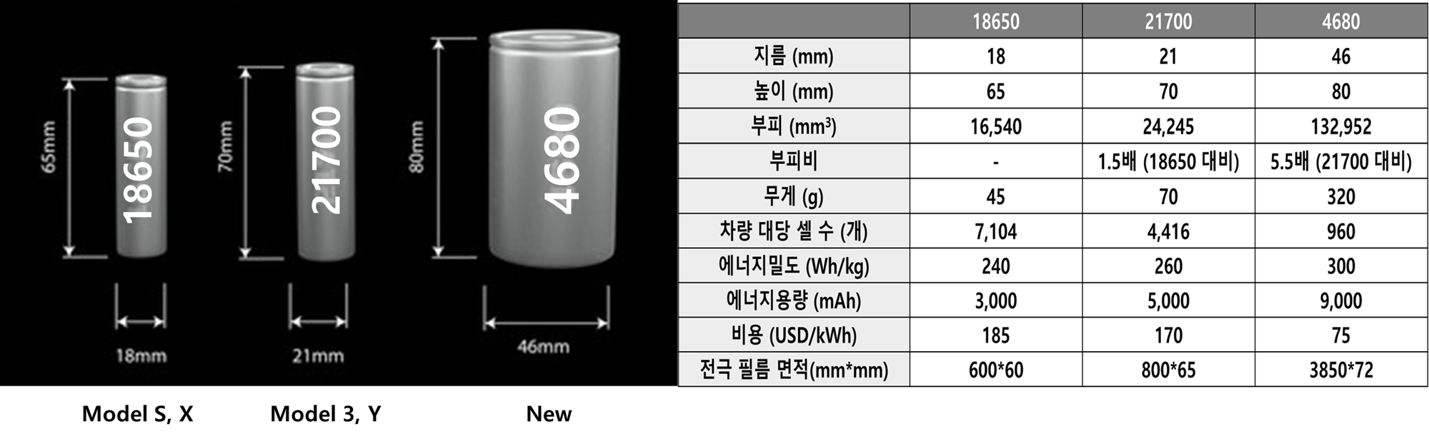 - 차세대 배터리 표준 4680셀 : 배터리 크기를 키워 단위 생산 비용을 감소시키고 탭을 없애 충전시간을 늘리면서 열배출 특성 개선, 출력밀도 증대