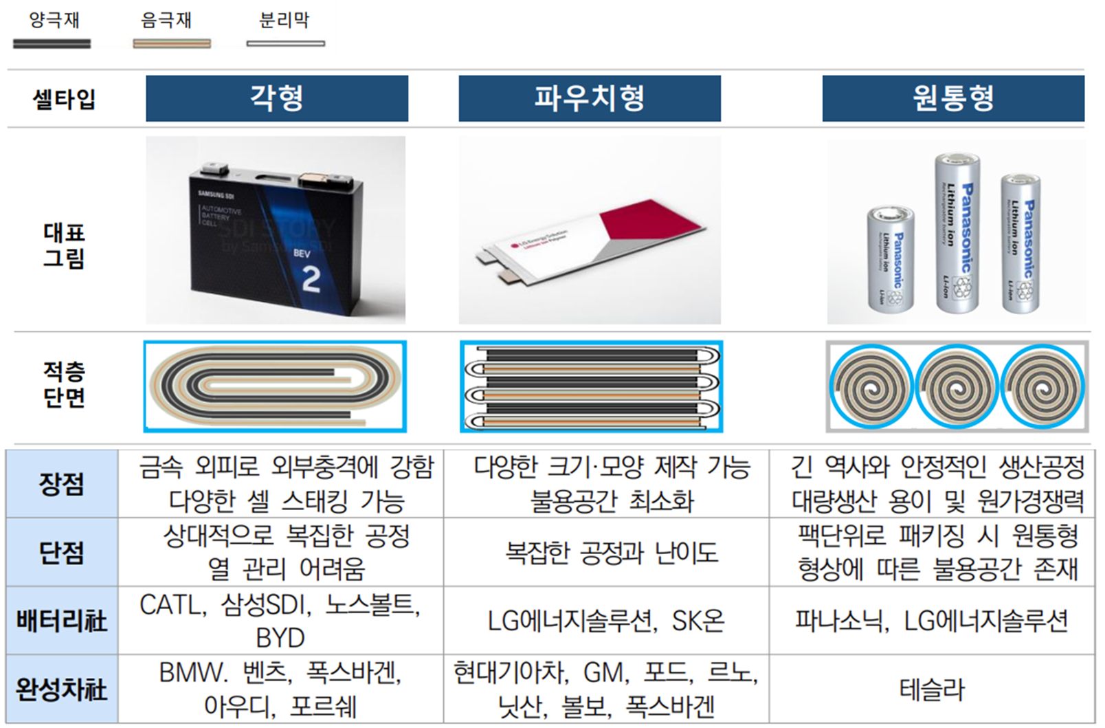 또한 셀의 크기가 커질 수록 배터리 팩의 공간효율이 떨어지고 각 전지를 연결하는 장착 비용이 들기 때문에 국내 셀 메이커 기업과 대부분의 완성차 업체들은 각형 또는 파우치형 배터리를 채택하고 있습니다.