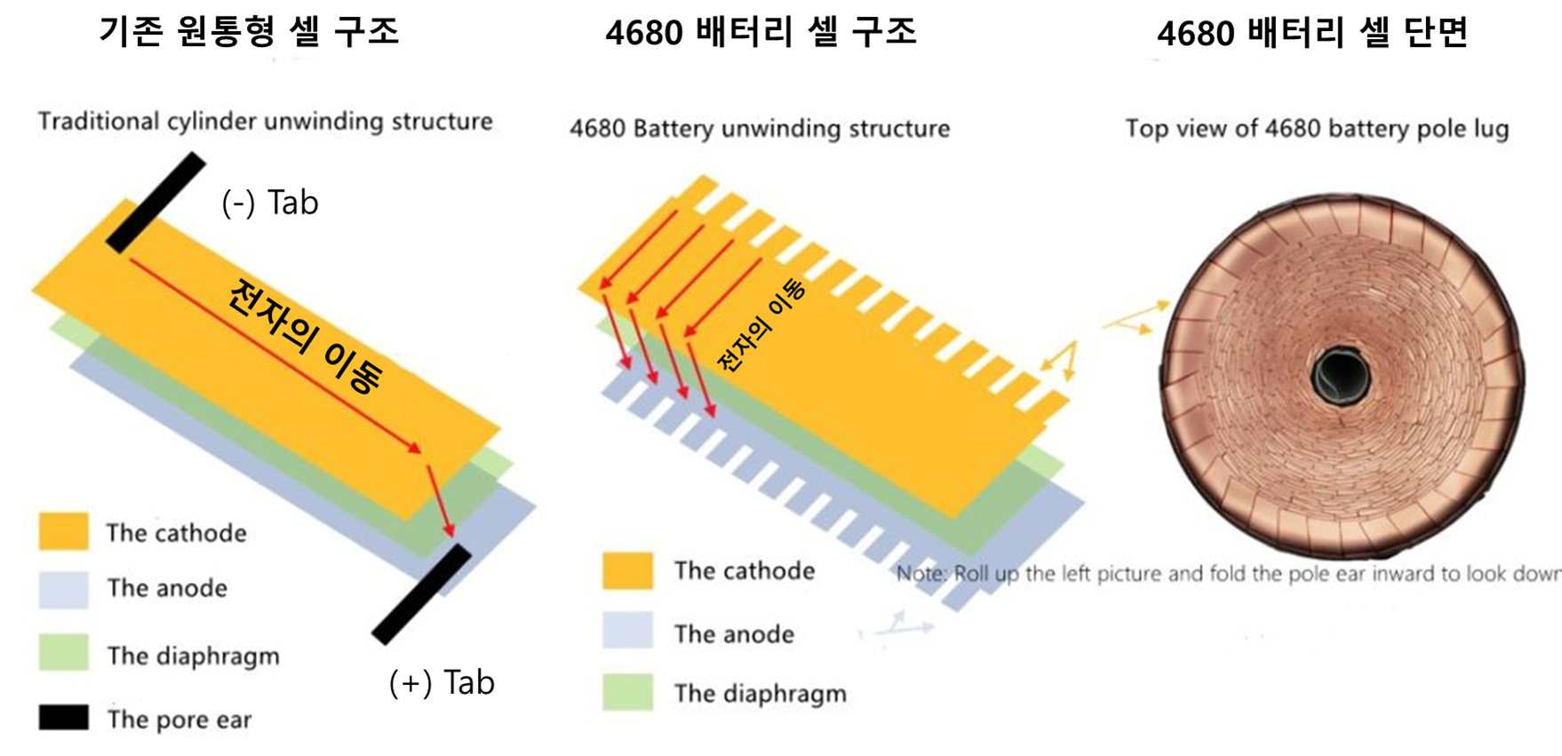기존 원통형 구조에서 전극 탭은 음극과 양극 각 끝에 부착되어 있었기 때문에 전자의 이동 경로가 전극 길이만큼 길어지게 됩니다.