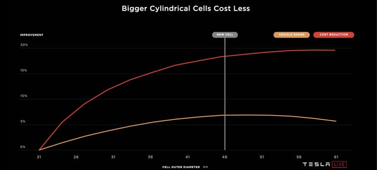 배터리의 크기가 커질 수록 에너지 용량이 증가하고 단위 용량당 공정 시간이 단축되기 때문에 생산성이 향상됩니다. 또한 배터리 전극을 넣는 원통 캔 사용량이 줄어들며, 배터리 셀 갯수가 감소해 셀들을 연결해주는 와이어링 등의 소재 사용 또한 줄일 수 있습니다.