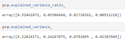 pca.explained_variance_ 및 pca.explained_variance_ratio_ 변수를 통해 각 주성분 축으로 투영된 데이터들의 분산값(공분산 행렬의 고유값)과 그 비율을 확인할 수 있습니다.