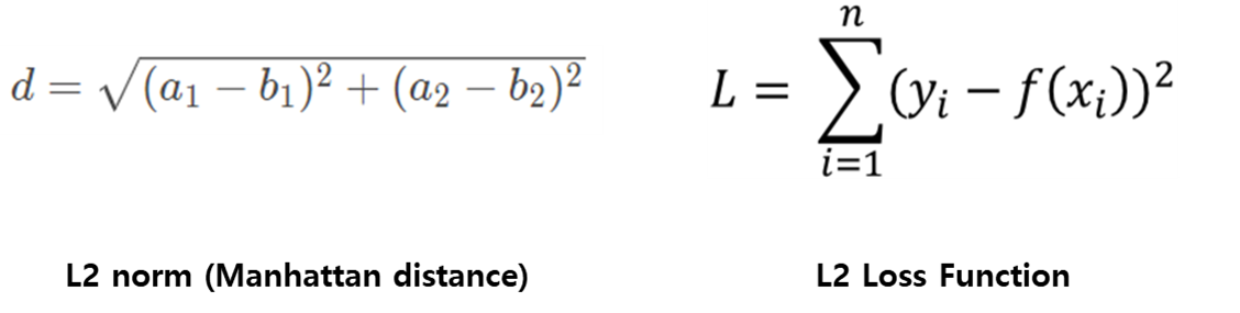 - L2 loss는 실제 값과 예측 값 오차들의 제곱의 합으로 나타냅니다.