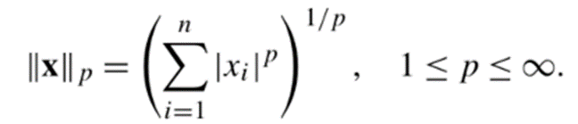 위 수식에서 n과 p는 실수이며, p는 norm의 차수, n은 벡터의 차원 수를 나타냅니다.