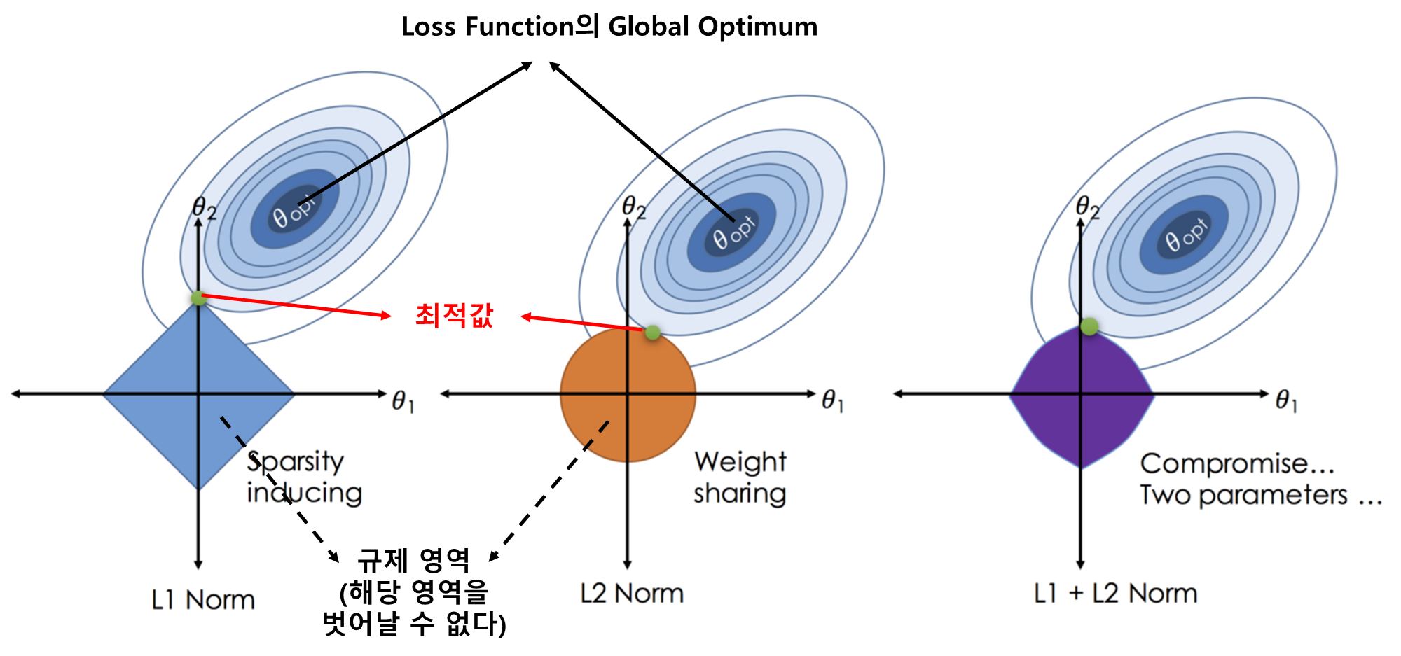 아래 Loss Function의 Space에서 L1, L2의 규제 영역을 두어, 실제 최적값에 대한 bias에 손해를 보더라도 variance를 낮춰 Overfitting 발생을 낮추는 것이라 이해할 수 있습니다.