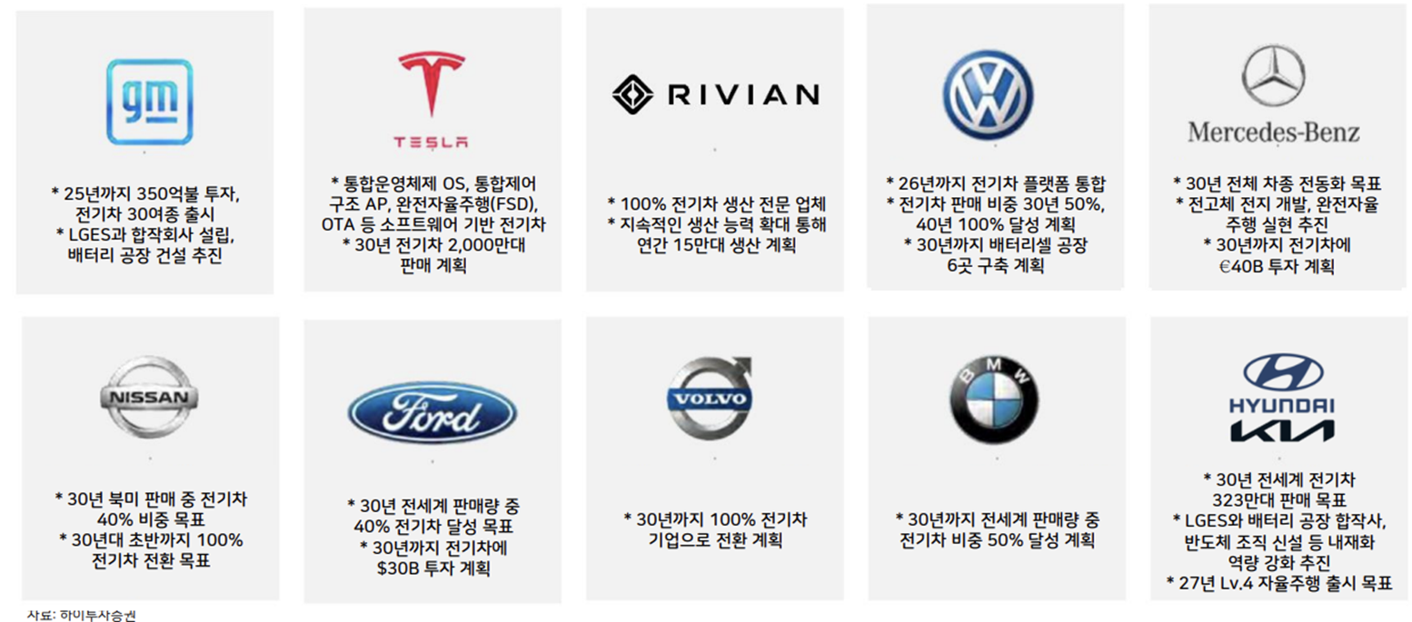 대부분의 국가에서 2035년부터 내연기관 자동차 판매 금지를 선언하고, 글로벌 전기차 침투율이 빠르게 증가하면서 대부분의 완성차 제조기업들이 전기차 연구개발 및 생산에 박차를 가하고 있습니다.