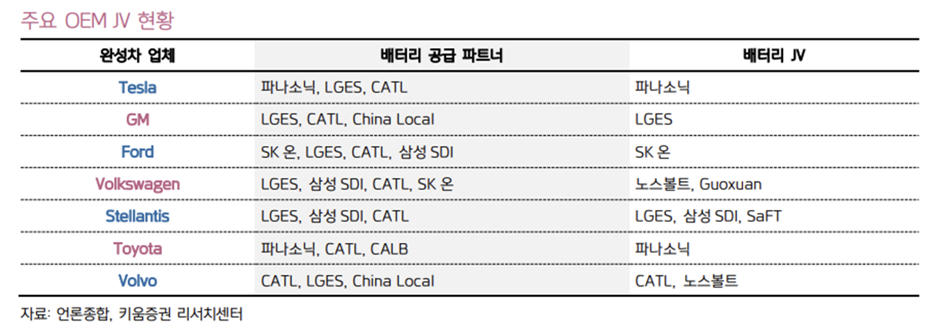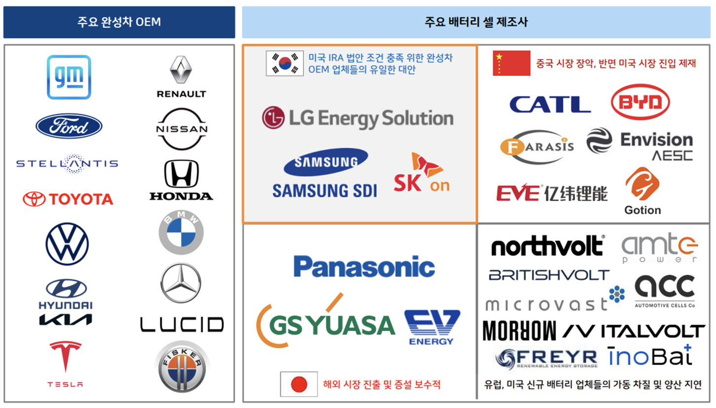 이들 완성차 업체는 배터리 가격 인하와 전용 플랫폼 개발, 안정적인 재료 수급을 위해 여러 배터리셀 업체와 협력하여 수직계열화에 나서고 있습니다.