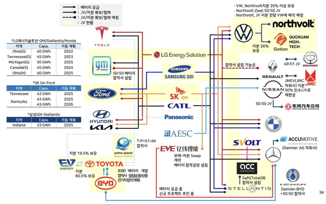 대표적으로 LG에너지솔루션은 미국의 GM과의 합작사인 ▲얼티엄셀즈, 일본 혼다와의 합작사인 ▲L-H Battery Company(가칭), 스텔란티스와의 합작사인▲넥스트스타에너지가 있으며,