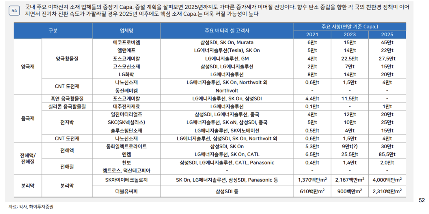 배터리 셀 업체의 CAPA 증가에 맞춰 배터리 소재 업체들도 추가적인 CAPA 증설이 진행될 것으로 보입니다.