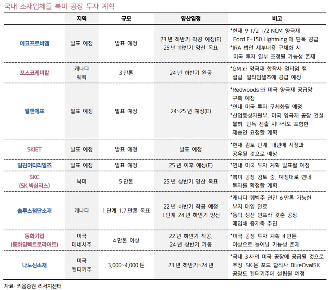 배터리 소재업체의 경우 양극재 기업들이 적극적으로 북미 진출을 하고 있습니다.