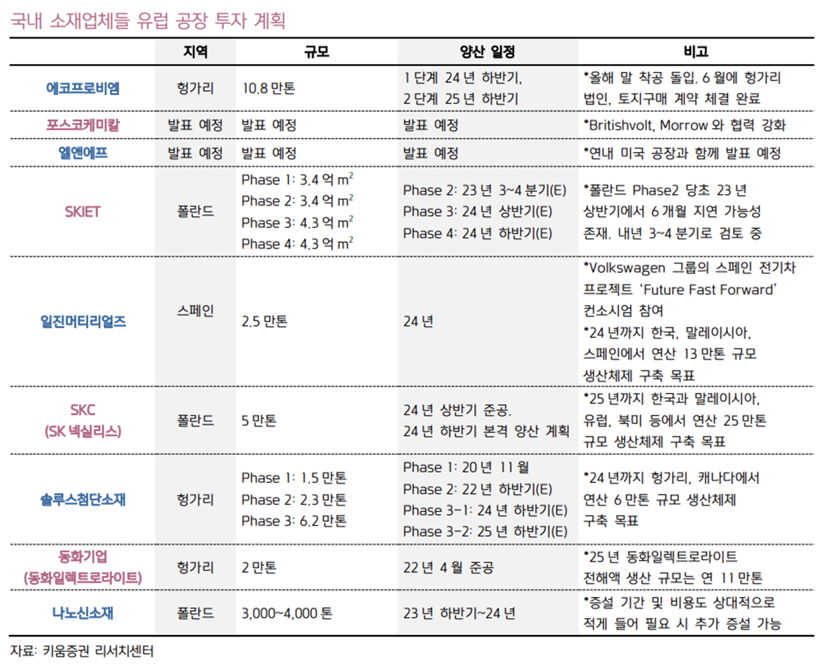 양극재 업체인 에코프로비엠은 헝가리에 10만톤 규모의 하이니켈양극재 공장을 건설해 삼성SDI 및 BMW에 납품할 계획이며, 나노신소재는 폴란드에 약 3천톤 규모의 CNT 도전재 공장을 건설할 계획입니다.