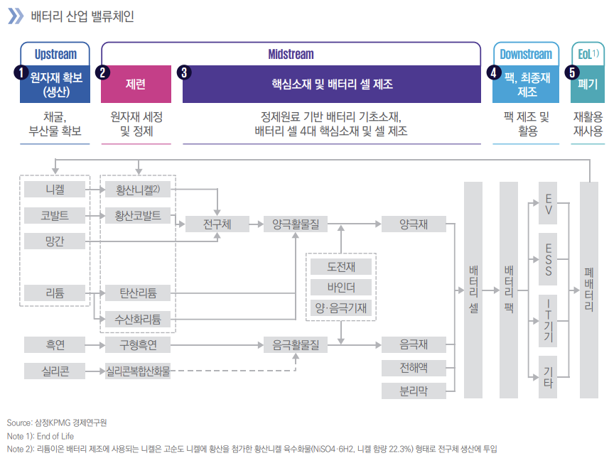 배터리 4대 핵심소재(양극재, 음극재, 분리막, 전해액)의 원재료가 되는 원자재(니켈, 리튬 등)의 채굴 및 가공 - 미드스트림 :