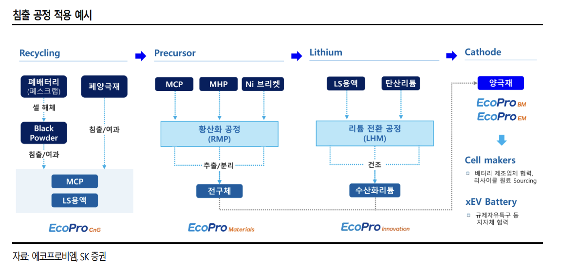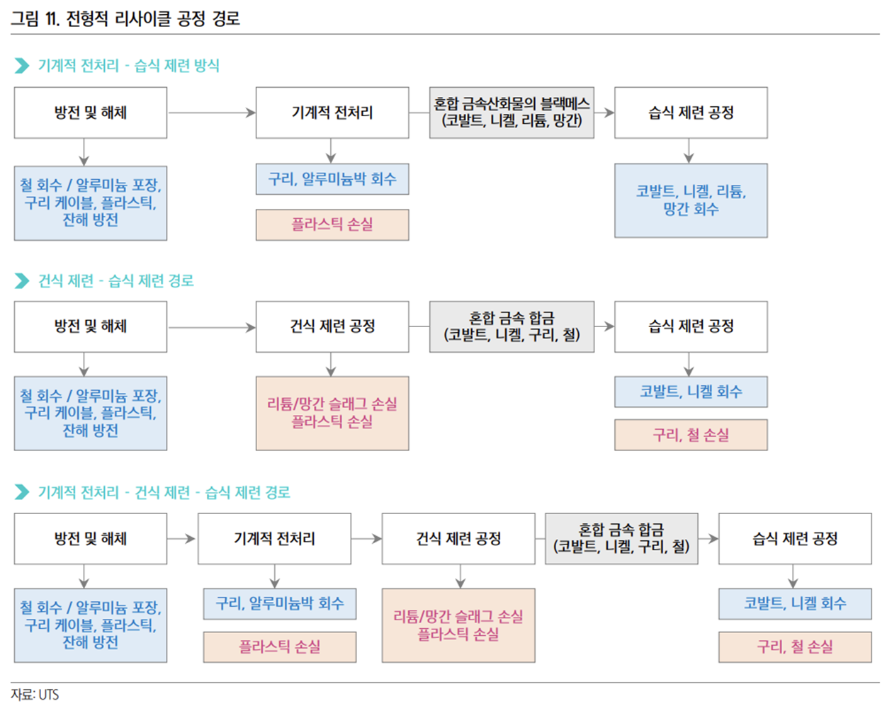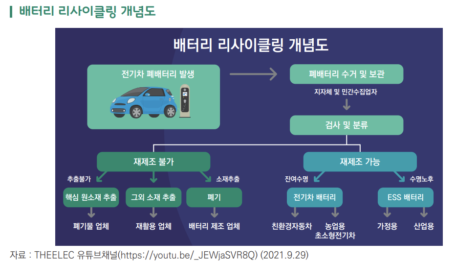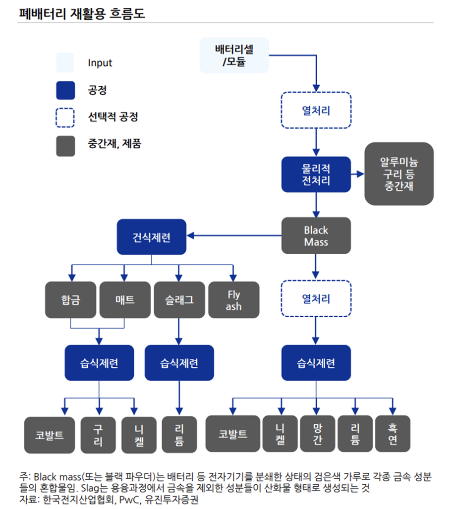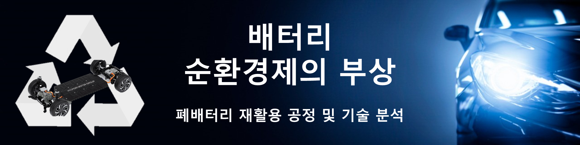 - 폐배터리 재활용 : 폐배터리를 셀 단위로 분해한 후 리튬, 니켈, 코발트, 망간, 구리, 알루미늄 등 배터리의 핵심 원자재 금속을 추출해 새로운 배터리 제조에 활용하는 방법