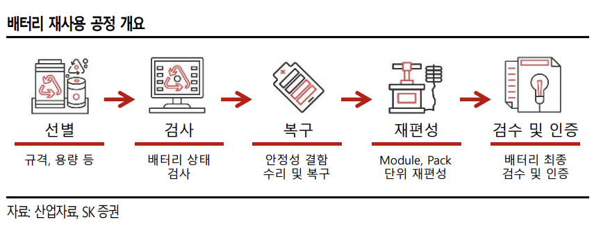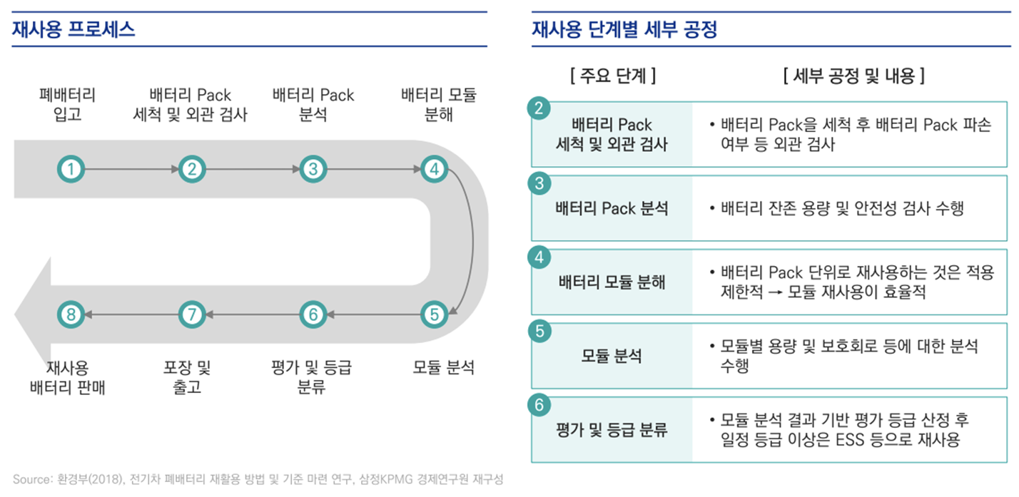 폐배터리의 재사용의 경우 전기차에서 나온 배터리 팩 및 모듈들을 분해한 후, 배터리 성능 및 잔존 용량, 안전성 검사 등을 수행하여 성능에 따라 전력 보조장치 또는 전력 저장장치 등으로 재사용하게 됩니다.