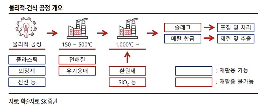 건식 공정은 대량 처리가 가능하고, 공정이 비교적 단순하여 난이도가 낮으며, 다양한 금속을 추출할 수 있다는 장점이 있어 많은 기업들이 사용하고 있는 방법 입니다.