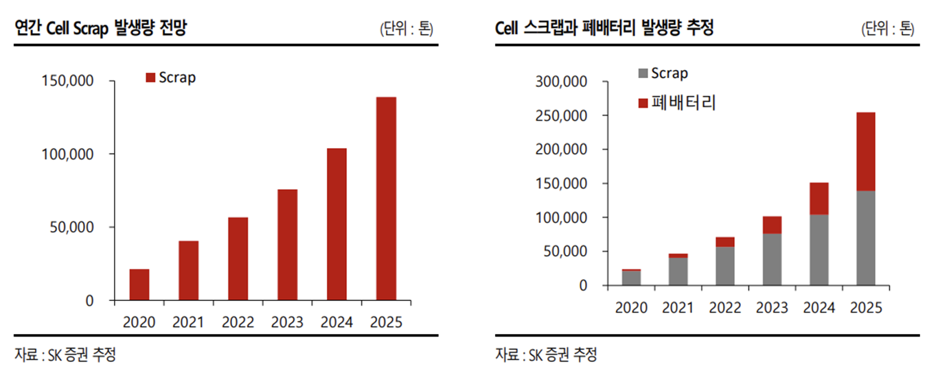 폐배터리가 본격적으로 발생하기 시작하는 2025년까지는 배터리 제조과정에서 발생하는 셀스크럽이 배터리 재활용에 주로 사용될 것으로 보고 있으며, 2026년부터 본격적으로 폐배터리 리사이클링 산업의 개화가 시작될 것으로 보고 있습니다.