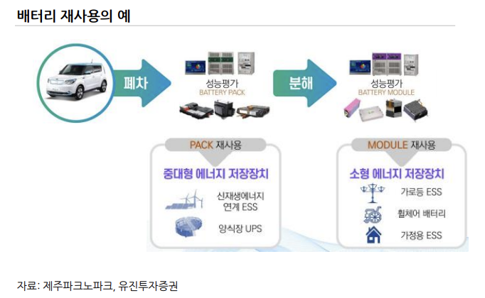 재사용되는 배터리 성능이 60~80%인 경우, 소형 EV, 골프카트, 무인 로봇 등의 배터리나 발전소, 충전소 등의 전력 보조장치 (UPS 등) 등으로 사용되며, 배터리 성능이 20~60%인 경우 가정용 ESS로 활용됩니다.