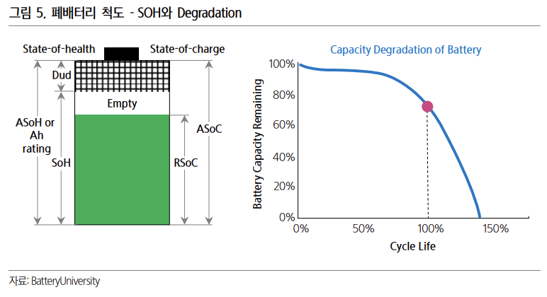 폐배터리를 결정하는 기준은 주로 배터리의 에너지 저장 상태를 의미하는 SOH (State Of Health)의 70~80% 값을 사용합니다.