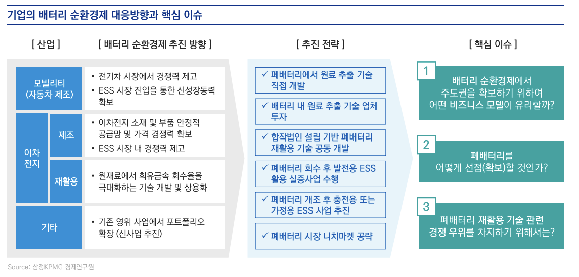 전기차 제조 등의 모빌리티 기업과 에너지 기업들은 주로 배터리 수거와 ESS 시장 진출을, 배터리 셀 및 소재 기업들은 자체적으로 원할한 원재료 수급 및 가격 경쟁력 확보를 위한 비즈니스 모델을 구축하고 있습니다.